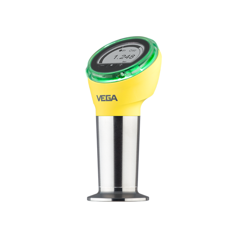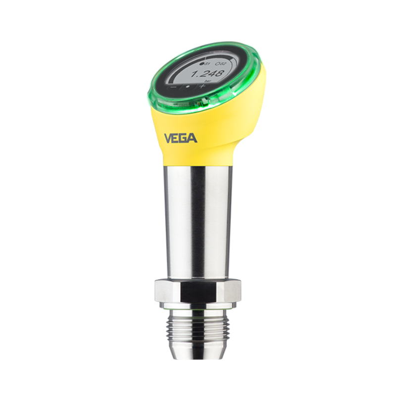 VEGABAR 38 is a universal pressure transmitter with ceramic measuring cell for measuring gases, vapours and liquids up to 130 °C. The optional universal connection for hygienic adapters ensures reduced installation effort and leaner stock keeping. The sensor has a display with on-site operation and coloured 360° status display.